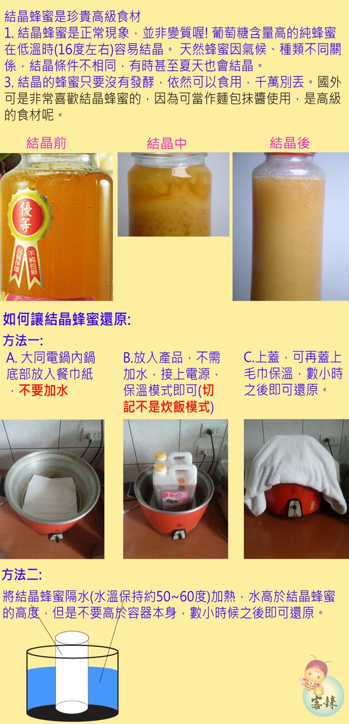 2. 葡萄糖含量高的蜂蜜於低溫時,容易結晶,此為自然現象,請安心食用。